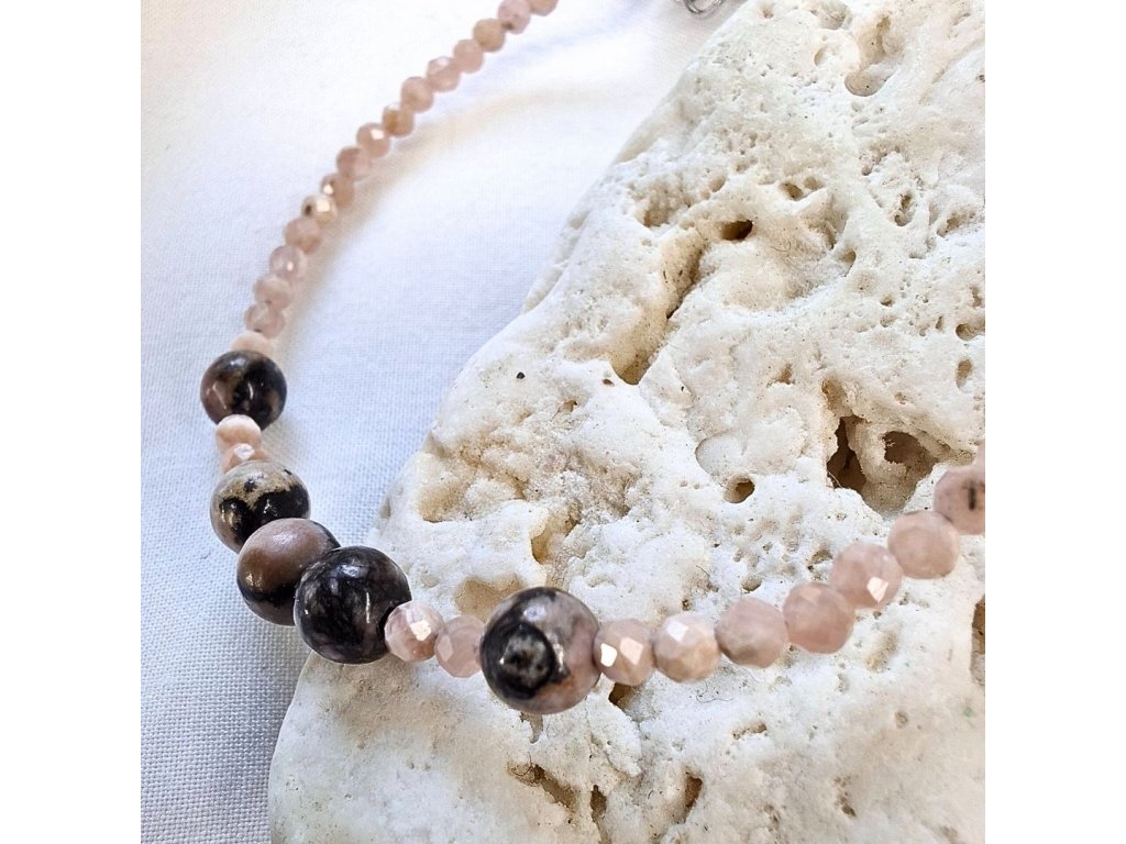Jemný náramek je spojením lásky, harmonie a emoční podpory. Rodonit pomáhá vyrovnávat emoce, zmírňuje stres a zesiluje pocit bezpečí a důvěry v průběhu těhotenství. Rodochrozit je kamenem mateřské lásky a soucitu, otevírá srdce a prohlubuje propojení mezi maminkou a miminkem ještě před porodem. Společně tyto minerály přinášejí jemnou energii, která podporuje klid, sebelásku a emoční rovnováhu.